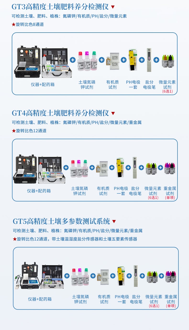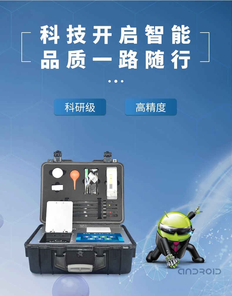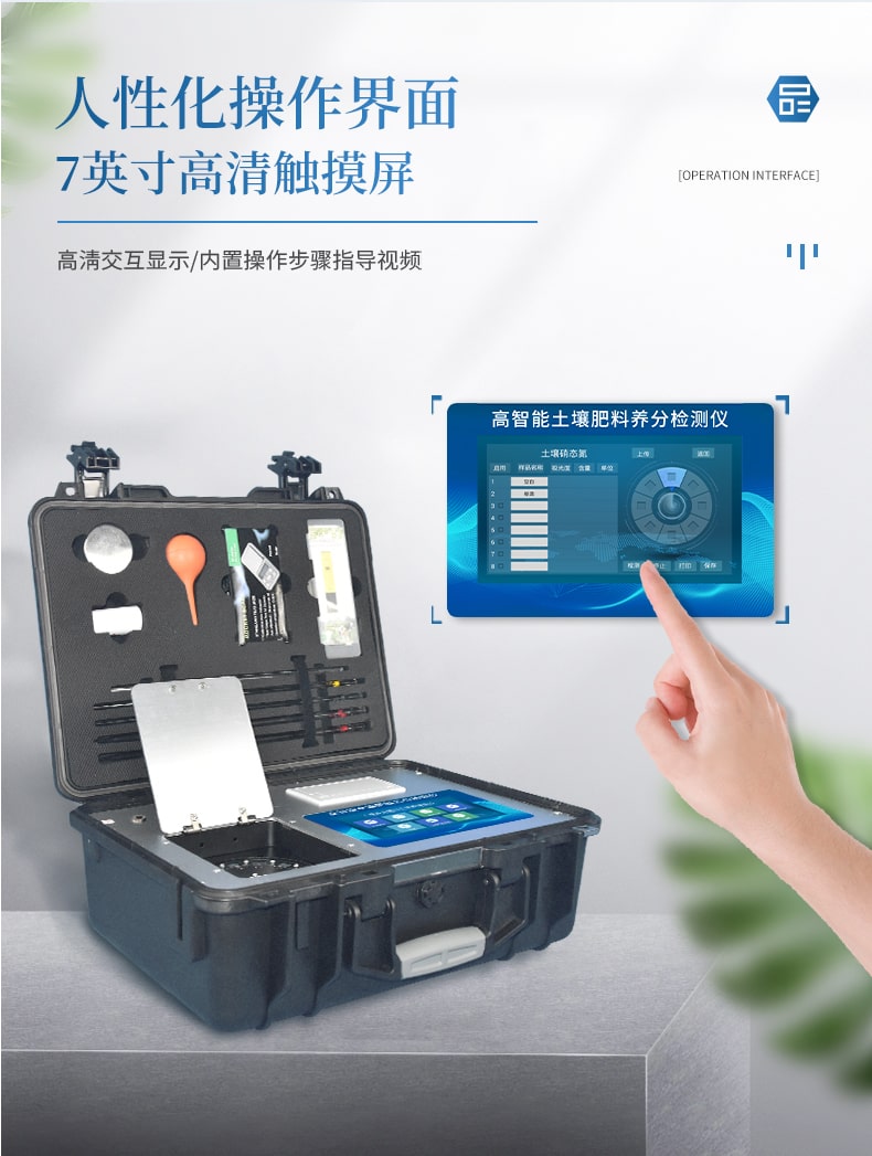 配套齐全:该仪器集药、器、仪为一体,携带方便,相当于一个小型移动实验室,亦可野外流动测试。适于农业服务部门或农资经销商、合作社、肥料厂商、大种植户测土施肥。