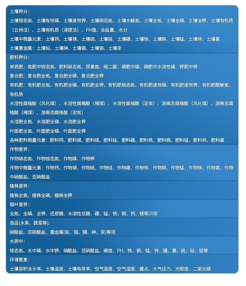 1、土壤养分:土壤铵态氮、土壤有效磷、土壤速效钾、土壤硝态氮、土壤水解氮、土壤全氮、土壤全磷、土壤全钾、土壤有机质(丘林法)、土壤有机质(浸提法)、PH值、含盐量、水分。