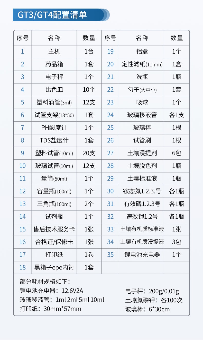 | 2 | PH计 | 1支 | 2 | 氮磷钾有机质试剂 | 1套 |